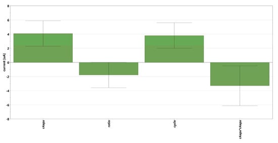 The optimization of performances was possible by a multivariate approach, that considered all factors together, including linear, quadratic and interaction terms in the model. All the selected factors were related to the electrosynthesis process. Among them, with the emphasis to develop imprinted materials, the relationship between all reagent should be described. Preliminary results have shown the factor’s importance on responses were the initial concentration of functional monomer (X1) and the number of CV cycles during the electrosynthesis (X3). Figure 2 shows the significant coefficients related to factors.