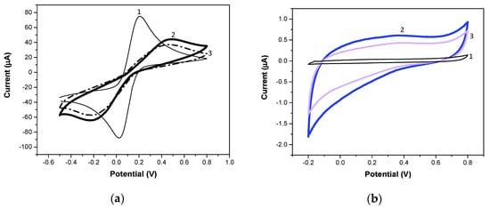 (a) Electrochemical characterization by CV (fifth cycle) in ferrocyanide-ferricyanide redox probe for (1) bare screen-printed carbon electrode; (2) Cd2+-ion imprinted polymer film/screen-printed carbon electrode (SPCE) and (3) non-imprinted polymer (NIP) film/SPCE after polymerization. Voltammetric condition: (i) Potential range: −0.5 to + 0.8 V; (ii) scan rate: 50 mV s−1; (iii) CV cycles: 5; (b) electrochemical characterization by CV (fifth cycle) in 0.1 M KCl for (1) bare screen-printed carbon electrode; (2) Cd2+-IIP film/SPCE; and (3) NIP film/SPCE after polymerization. Voltammetric condition: (i) Potential range: −0.2 to + 0.8 V; (ii) scan rate: 50 mV s−1; (iii) CV cycles: 5.