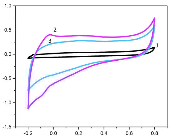 Electrochemical characterization by CV (fifth cycle) in 0.1 M KCl for (1) bare screen-printed carbon electrode; (2) Cd2+-IIP film/SPCE; and (3) NIP film/SPCE after treatment in 250 mM NaOH for 3 min. Voltammetric condition: (i) Potential range: −0.2 to + 0.8 V; (ii) scan rate: 50 mV s−1; (iii) CV cycles: 5.