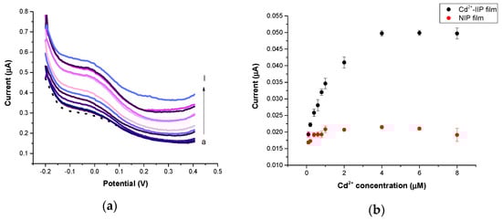 The electrochemical sensing of Cd2+ ions was performed by DPV measurements on NIP and Cd2+-IIP film: 100 mM sodium acetate buffer (pH = 5) was selected as the electrolyte solution for the determination of Cu2+ ions. DPV measurements recorded for Cd2+-IIP film are shown in Figure 5, and related calibration curves are also reported (Figure 5b).