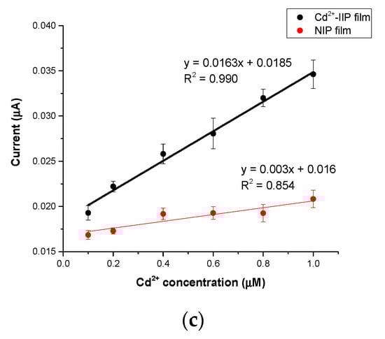 As shown from Figure 5a, the current responses value increased within the tested Cd2+ ion concentration. However, saturation reached value upper than 2 µM, due to the occupancy of cavities. Notably, the imprinted sensor shows high affinity and specificity towards Cd2+ ions compared to that obtained for NIP films, confirming the imprinting effect on this polymer. The linear regression was established between 0.1 and 1 µM, with a sensitivity of 0.0163 µA µM−1. In addition, it was possible to evaluate the imprinted factor as 6.86, highly indicating the specific recognition of template from imprinted cavities on Cd2+-IIP films.
