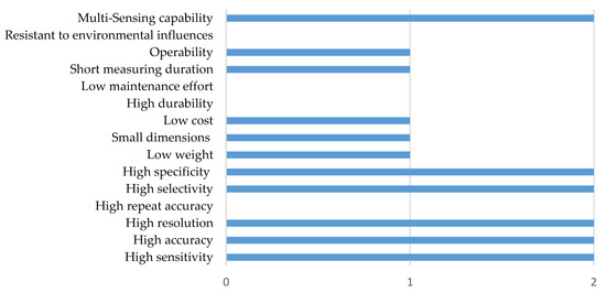 In each field of application (see Section 2.3) for odor detection sensors, there are different requirements for the technology used, which can be reflected in assessments of technical performance criteria. Sixteen technical performance criteria (see Section 2.2) that can be used especially for the description of the requirements of odor detection applications were established within this study through expert workshops and literature research. In order to specifically assess the importance of these criteria for the fields of application, a comprehensive expert survey was conducted with 11 experts from renowned research institutes and companies active in the fields of olfactory sensing electronic noses. Each of the participating experts had extensive experience in the research and development of odor sensors. The quality of the survey was, therefore, ensured by the targeted selection of experts who were able to classify the complex relationships between the product characteristics and their respective importance in the application fields and markets. The experts were asked to answer questions about which criteria were more or less important for each application field. For this purpose a scoring model was introduced to quantify the qualitative estimates for visualization, as follows: 0 = not important, 1 = rather unimportant, 2 = important, 3 = very important. In summary, the results of this survey were visualized in specific requirement profiles for each of the fields of application considered by forming the mean values of the scoring points. Additionally, all individual criteria were assigned to three related classes or categories. The first category combined all criteria related to measurement quality. This included the resolution and sensitivity of the sensors. The second category included the handling and the operability of the sensors. For example, measuring duration, maintenance effort, and multi-sensing-capability were assigned in this category. The third category combined production parameters such as manufacturing costs, weight, durability, and dimensions.