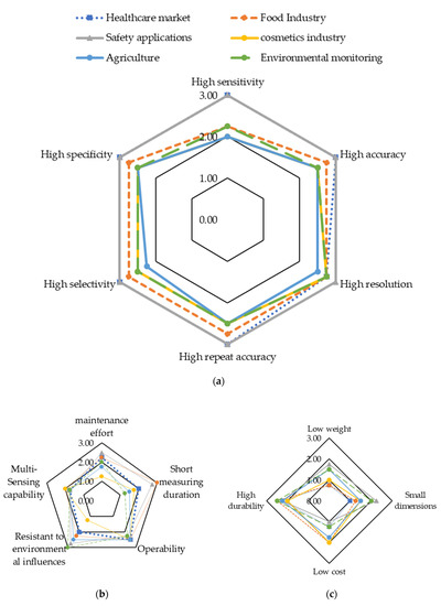 The criteria related to the construction and production of the sensors are summarized in Figure 3c. The geometric dimensions of the sensor tended to play a more important role in safety applications, since mobile applications such as explosives’ detection or people searches are potentially more common there. This could also be the case for environmental monitoring, which is why the criterion for this field of application was also rated important. The weight of the sensors was also considered important for safety applications due to mobile applications. Rather unimportant ratings were, however, given to this criterion for environmental and agricultural applications. Weight tended to play a smaller role for mobile applications than dimensions. Due to the large areas to be monitored by sensors, drone applications can play a central role in agricultural applications in the future, which was the reason for the relatively higher importance of this field. Weight would be a decisive factor here. The durability rates varied in their importance for all application fields between a narrow range of 2 for the cosmetics industry and 2.5 for the environmental monitoring and food industry. Therefore, this criterion is important for all application fields. According to the experts, low cost production tended to play a more important role in the food and cosmetics industries than in the other fields of application rated as rather important. This could be due to the high competitive situation in this market, where manufacturing costs play a major role in gaining a competitive advantage over the competition.