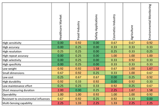 The statistical variances of the survey results are summarized in Figure 4. It can be seen that in some cases there was a high degree of uncertainty regarding the assessment of the importance of technical performance criteria in certain fields of application. The measurement time in the healthcare market and the cosmetics industry as well as the multi-sensing capability for the health care market, safety applications, agriculture and environmental monitoring should be emphasized, with variances higher than 2.