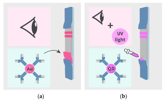 Schemes of lateral flow immunoassay (LFIA) formats developed in the study: (a) Conventional colorimetric AuNP-based LFIA, (b) fluorescent QD-based LFIA.