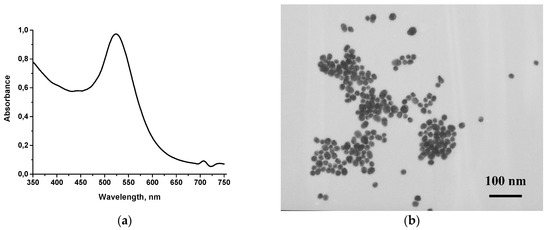 AuNPs were used as a marker in conventional LFIA. AuNPs of a diameter close to 30 nm were reported to be optimal for traditional immunochromatography [15]. To prepare AuNPs with diameter of 30 nm, a simple method of sodium citrate-associated reduction of chloroauric acid was applied. The size and shape of AuNPs were estimated by TEM and UV-vis spectroscopy (Figure 2). The as-prepared AuNPs showed localized surface plasmon resonance at 523 nm. The TEM image revealed spherical morphology and homogeneity with a size distribution in the range of 29.5 ± 7.4 nm and a degree of ellipticity of 1.3 (Figure 2b). According to the manufacturer, the size of carboxyl quantum dots varies from 15 to 20 nm.