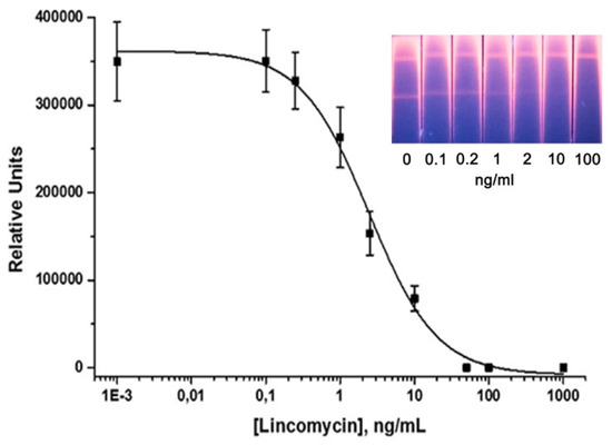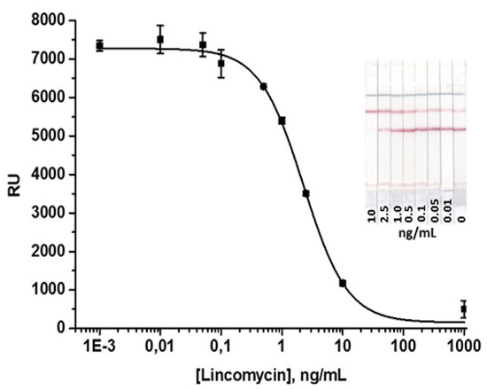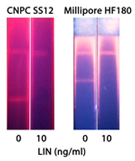Given the need to detect a low molecular weight compound in this study, a direct competitive LFIA format was performed. In this assay, free LIN present in the sample competed with the immobilized LIN–BSA conjugate in regard to binding with specific anti-LIN antibodies, which were, in turn, detected by employing different nanosized markers and detection techniques. The preliminary characterization of the immune properties of monoclonal anti-LIN antibodies used by ELISA confirmed their high affinity (data not shown) and allowed for the development of LFIAs.