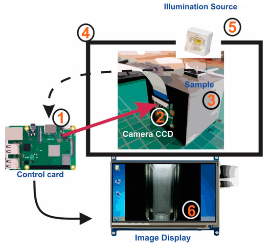Schematic representation of EE system for digital image measurements of Tequila samples. 1: Control card (Raspberry 3B+); 2: Digital camera CCD v2 Raspberry; 3: Fixed holder and cuvette; 4: Closed box for light control; 5: LED; 6: Image Display 7″.