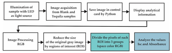 Three hundred fifty Tequila images were captured (50 photos for each tequila sample). Each image was captured by the camera CCD Raspberry V2 and saved as an 8-bit JPG format on the Raspberry model 3B+ memory, the average size per image is 2.7 MB (8 Megapixels resolution, focus of f/2, 2592 × 1944 pixels). It was monitored during all experimental stages that the chassis remained closed during image capture, avoiding external light to get good quality images.
