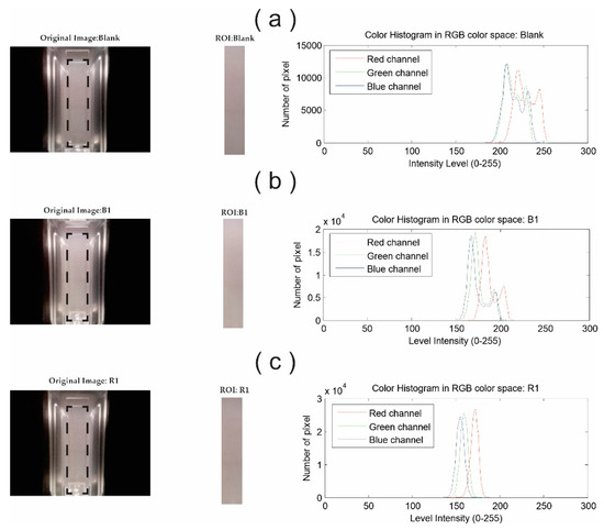 The selected ROI is automatically defined and fixed for all analyzed sample images. The ROI was chosen considering the UV-Vis viewing window of the cuvette. In this way, the region of interest and its relative position regarding the sample support is always constant. Figure 5 shows three original images captured from some representative samples; the black dotted lines within the cuvette image denote the selected ROI, as well as the RGB intensity histogram associated with it. Furthermore, it can be seen in the histogram graphs that the color components are very close to each other, especially the green and blue ones. The three components reach a maximum intensity value of 255 (along the x-axis in graph).
