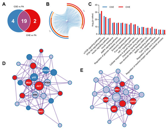 Venn diagram illustrating the overlap of differentially phosphorylated protein in adipocytes by coffee silverskin (CSE) and coffee husk (CHE) aqueous phenolic extracts (A), circos plot illustrating the biological processes modulated by CSE and CHE indicating which are shared among treatments (B), KEGG pathways associated with the differentially phosphorylated proteins (C), and protein–protein interaction networks built with Metascape from the differentially phosphorylated protein in hepatocytes by CSE (D) and CHE (E).