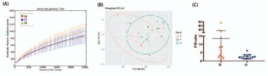 Gut microbiota analysis in obese children baseline (t0), after 4 months DHA supplementation combined with diet–lifestyle intervention (t1), and after an additional 4 months of dietary–lifestyle intervention without DHA supplementation (t2). (A) Alpha-diversity (observed species metric is reported) showed no significant differences in gut microbiota biodiversity; (B) Principal Coordinate Analysis (PCoA) according to Weighted UniFrac distance: t0 samples (red) significantly (p < 0.05) separate from t1 samples (green); (C) Firmicutes/Bacteroidetes (F/B) ratio significantly decreases (p < 0.05) at t1 (blue) compared with t0 (red).