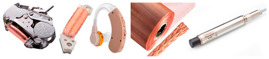 Fine wire is manufactured with metals such as stainless steel, gold, magnesium, tungsten, rhodium and copper by a sequential multi-pass wiredrawing process [1,2,3,4,5,6]. Copper fine wires have a wide range of applications as semiconductors and bonding wire in electronics, medical devices, shielding applications or measurement sensors, as is shown in Figure 1.