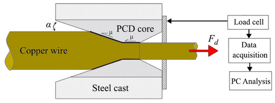 In a second experimental phase, the single-step wiredrawing at different speeds were implemented with the aim of calculate the friction coefficient (μ) using a mineral oil lubricant and calculating the lower value for μ from these experimental results. The experimental procedure was done using a single block drawing machine and a conical wiredrawing die with a core made of polycrystalline diamond (PCD) with 2α = 14° and Lc = 50%∙df, geometrical features and core material recommended by Esteves group [25], commonly used in the case of copper wiredrawing. The drawing stress σd was determined by a direct measure of the drawing load (Fd) with a load cell and signal acquisition system installed on the machine (Figure 4). Finally, the optimal values of μ were determined indirectly, analytically and by polynomial interpolation of the results.