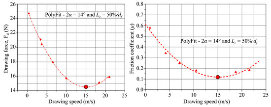 The polynomial fitted values of the minimum drawing force Fd and lower coefficient of friction μ as a function of different values of drawing speed (v) used in the experiments, for a die with 2α = 14° and Lc = 50%∙df lubricated with 100% mineral oil.