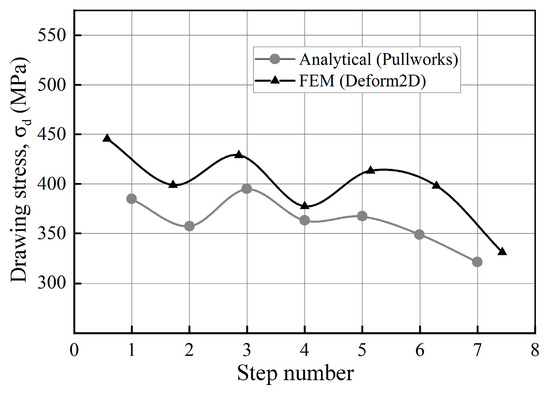 It has been observed that the results obtained by both methods for the values of drawing stress and drawing force shown a very similar evolution (Figure 6). The values obtained by the FEM simulations are slightly higher than those obtained from the calculations performed analytically by means of the software application PullWorks. This fact is in line with the conclusions obtained in the work of Luis et al. [30] and that is because the analytical method only considers the effects of homogeneous deformation and friction, unlike the numerical model, which takes into account the effects due to the additional energy required as a consequence of the non-homogeneous deformation that occurs in wiredrawing process.