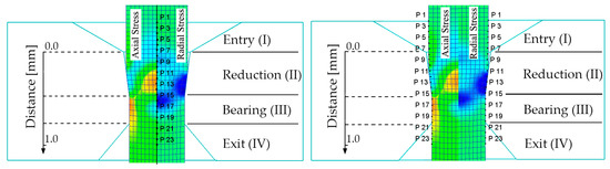The radial and axial stress distributions were simulated assuming the optimum value of the friction coefficient μ = 0.127 since this condition corresponds to the minimal tool wear and optimum drawing speed, as shown in Figure 5. The simulation snapshot in Figure 7 shows the differentiated zones in the standard geometry of the drawing die and the 23 tracked nodes in a displacement of 1 mm, from a fixed starting point of the reduction cone area (II) to the exit zone (IV).
