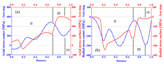 From FEM simulations: (a) axial and (b) radial stress (step 2); (blue) center, (red) surface.