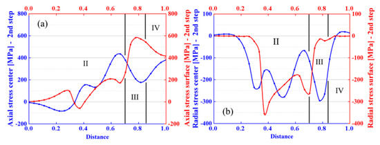 From FEM simulations: (a) axial and (b) radial stress (step 7); (blue) center, (red) surface.