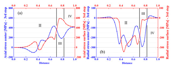 From FEM simulations: (a) axial and (b) radial stress (step 3); (blue) center, (red) surface.