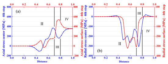 From FEM simulations: (a) axial and (b) radial stress (step 4); (blue) center, (red) surface.