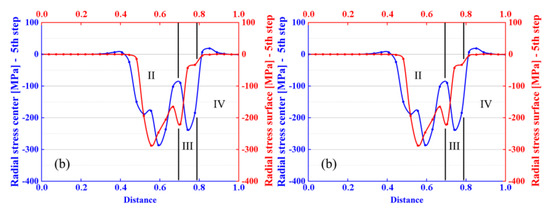 Compressive radial stresses (σradial) show a maximum near 300 MPa in the surface points, in all the steps of the sequence, Figure 8b, Figure 9b, Figure 10b, Figure 11b, Figure 12b, Figure 13b and Figure 14b. This circumstance is in agreement with the results obtained by Martinez [30]. The evolution of this response parameter shows a marked increment in its value in a point just entering bearing length, in the case of surface radial stress σradial (surface), while on the contrary, the radial stress in the center points decreases just in the same contact point.