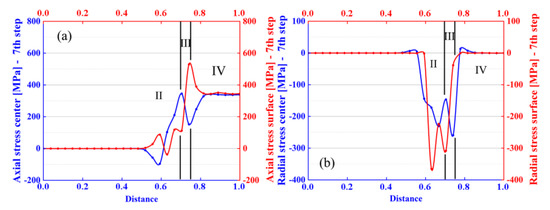 Figure 8, Figure 9, Figure 10, Figure 11, Figure 12, Figure 13 and Figure 14 show the simulations allowed to obtain the compressive radial (σradial) and axial (σaxial) data stress evolution when the wire goes to different zones through the die, in the surface and center of the wire (Figure 2b). Marks II, III, IV indicate the different zones trough the drawing die.