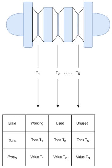 The stock of managed rolls in the factory is particularly high, having usually more than 4000 registered rolls, each with its specific features such as dimension, alloys, geometry, etc. The rolls are grinded and shaped with several tracks, as depicted in Figure 2, each having its own state, which can be working, used, or unused, and its properties, such as the number of tons rolled since it was assembled. Each track is used independently of the others of the same roll for a specific assembly and once the track is worn, the roll is disassembled and that track is marked as used, being the roll able to be assembled again if it still has unused tracks. Each time new rolls are received and whenever all the tracks of a roll are used, its tracks are prepared, that is they are grinded, textured, and chromed, resting ready to be used.