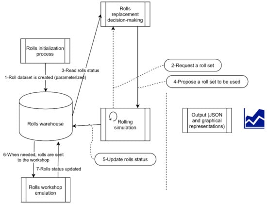 The general schema of the simulator can be seen in Figure 3. As it is depicted, at the beginning, the variables are initialized. To do that, the simulator receives a JSON file as input with the required values and using them the roll dataset that will be used as the rolls warehouse’s stock is created (1). Next, the simulation starts, and, for each scheduled batch of orders, it requests a group of rolls (2) to replace the assembled ones. In order to do this, it has to read the rolls status (3) and once known, it proposes a roll set to be used (4). This part is designed as a separate module, because one of the main goals of this simulator is testing different approaches and comparing results among them. In order to try a first approach that could be used for validation of the present work, a backtracking algorithm has been implemented. The backtracking algorithm is executed for each vein and takes the compatible rolls for each of the stands, that are those which meet the geometry and shape requirements. Then, it checks for each stand its constraints: the two rolls of the same vein must have the same diameter and the diameter restrictions among the rolls of the current stand and the rolls of the previous stand have to be met. If not, it backtracks to the previous stand.