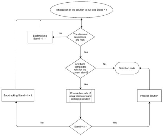 There are N stands from 1 to N. At each step the diameter restrictions for the rolls that have been selected are checked and if they are fulfilled, it checks whether it has compatible rolls for the current stand (i) and goes to the previous stand otherwise (i − 1). If there are not compatible rolls for the current stand, the selection algorithm ends and no set is proposed, but if there are, two rolls of equal diameters are chosen and added to the solution. Then, it checks whether there have been chosen rolls for all the stands (stand = N), and if so, the solution is processed and the algorithm ends. If not, it continues with the next stand (i + 1). Each of the stages of the simulator is described in more detail below.