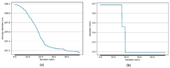 The batches defined in the configuration file are launched a certain amount of times defined previously and, for each batch, the diameter of the rolls is reduced according to a simple model which has been developed taking into account the number of tons laminated, the initial diameter of the roll, its geometry, and the shape of the track that works. Finally, the results are written to a JSON file and to observe them, they can be shown graphically by plotting the average, median, mode, and range diameters for each geometry and shape as well as the percentage of rolls grinded for each batch. In Figure 5a, the evolution of the average diameter for a particular type of roll, with a particular geometry, number of positions, and shapes of each of them is shown. This measure is an indicator of the remaining life of this set of rolls, and some indicators, as the tons rolled by millimeter could be derived. In Figure 5b, the evolution of the diameter of a particular roll is shown, as it is seen it has been assembled twice, and then the roll was no longer used.