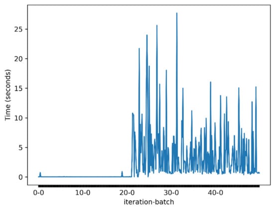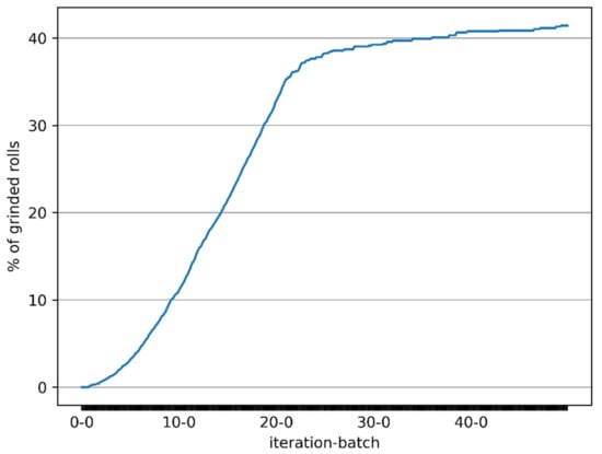 In Figure 6, a set of eight batches has been launched fifty times (iterations) and the cumulative percentage of rolls grinded after each batch has been plotted. This is an indicator of how many rolls in the set have been grinded, and thus, their diameter has been reduced. The goal is to reduce diameters in a homogeneous way, to avoid that the differences in diameters in the collection or rolls are enlarged, which would imply a higher difficulty to find compatible rolls, forcing larger diameter reductions, with the consequent reduction in cylinder life. It is indicated in the X axe as iteration—batch, that is number of the execution—number of batch executing.