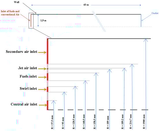 The rotary kiln used in this paper was assimilated to a real kiln with 46 m in length and 3.8 m in diameter, and it was specially equipped with a multichannel burner (see Figure 1). For simplification, the calculation was started from the fuel injection (i.e., from the burner nozzle end). Therefore, the domain of calculation considered was a 2D axisymmetric rectangle with a multi-entry for fuels and airs. Also, the burner entry geometry was modified for modeling facilities (for more details, see [16]).