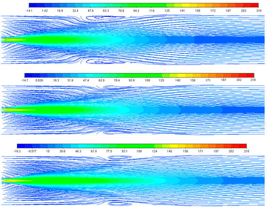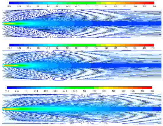 Streamlines of axial velocity without DPM (STD, RNG, and RKE respectively from the top).