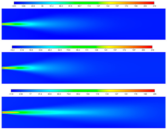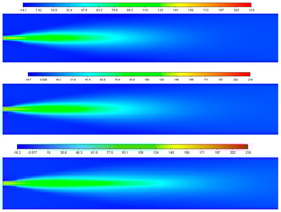 Axial velocity contours without DPM (STD, RNG, and RKE respectively from the top).
