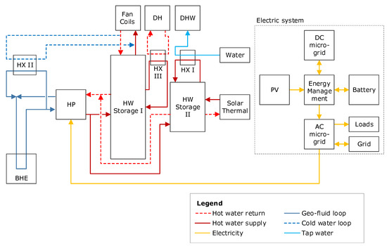 Structure of hybrid thermal energy supply system. BHE—borehole heat exchanger; HX—heat exchanger; DH—district heating; HP—heat pump; HW—hot water; DHW—domestic hot water; PV—photovoltaic panels; DC—direct current.