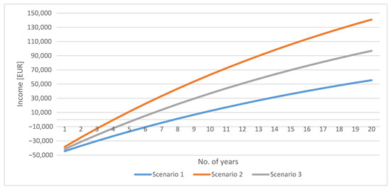 The summary of the results of the technical-economic analysis is presented in Table 4, while in Figure 2, the evolution curve of the payback period for all analysed scenarios is shown.