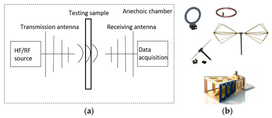 (a) Shielding effectiveness wave guide-based method schematic test set-up; (b) types of antennas, constructive solutions.