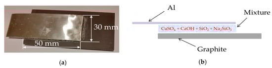 1.2 g CuSO4 with 0.18 g CaOH and 0.08 g SiO2 were mixed until homogenized, after which 2 mL of 30% Na2SiO3 solution was added. A homogeneous paste was obtained, which was applied to a graphite plate of 5 mm thickness, and over it was placed an aluminum strip of thickness 0.5 mm and width 30 mm. The graphite/mixture/aluminum overlap area is 50 × 30 mm2.