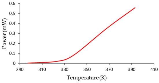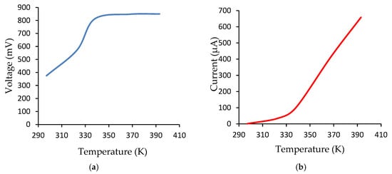 Analyzing Figure 4, it is found that from 330 K, the system is activated so that the output voltage reaches a maximum value around 850 mV and remains constant, and the output current has a linear increase, the slope of the line being high.