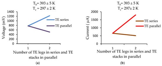 (a) The output voltage of the thermoelectric generator for serial and parallel connection; (b) the output current of the thermoelectric generator for serial and parallel connection.