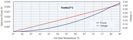 Figure 7 shows a graph from the technical data sheet of the commercial thermogenerator 1MD03-024-04/1, in which the variation of the electrical voltage and the electrical output power according to the temperature of the hot plate is observed [].
