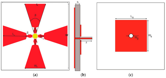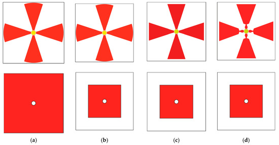 The proposed antenna consisted of a central circular patch and four radiation cells graved on h = 0.8 mm thick Rogers RT5880 substrate with a relative dielectric constant of 2.2 and a dissipation factor of 0.0009. A square-shaped ground plane is printed on the bottom surface of the substrate as shown in Figure 1. The first (yellow area) part is a circular patch located at the center of the proposed antenna, which is connected to the inner pin of the coaxial cable. The second (red area) parts are four fan-shaped radiation cells, which distribute around the antenna center symmetrically as shown in Figure 1a.