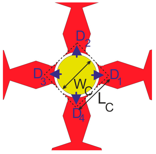 The size of the substrate is (W × L × h) = (60 mm × 60 mm × 0.8 mm). The radiation elements are connected to the central circular patch using four switches in the gap between them, the width of this gap is 0.3 mm. The four PIN diodes are mounted in the gap between the circular patch and the four parasitic patches as shown in Figure 2. This antenna was obtained after many optimizations using an electromagnetic simulator (CST Microwave Studio). The optimized parameter values of the proposed wideband reconfigurable radiation pattern antenna are given in Table 1.