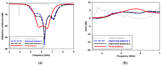 In order to enhance the impedance bandwidth, a change in the ground plane was implemented as shown in Figure 3b. Meanwhile, as in the case of the previous step, on the top side of the substrate, the antenna geometry remains unchanged. As given in Figure 4a, the improved antenna 1 resonates at 6.29 GHz with −10 dB impedance bandwidth that ranges from 5.83 to 7.27 GHz. Note that the improved antenna 1 has a bandwidth greater than that of the initial antenna. On the other hand, the maximum simulated gain value is around 4.30 dB as shown in Figure 4b.