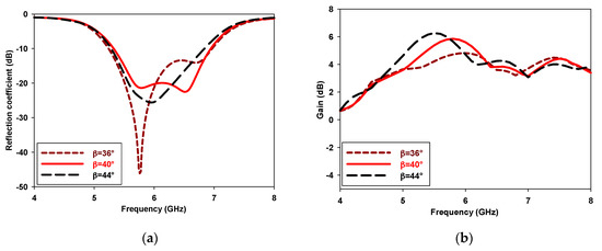 The antenna gain and parameter (S11) (dB) are also simulated as a function of the angle β variation. As presented in Figure 6a, the frequency resonances are shifted. Meanwhile, the antenna becomes more adapted when β = 40°. Likewise, the antenna gain is larger at the 5.8 GHz frequency when the angle α increases from 36° to 44° as shown in Figure 6b. Therefore, the optimum value of this angle is β = 40°.