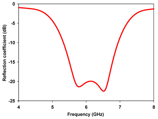 The reflection coefficient (S11) (dB) of the proposed wideband reconfigurable antenna is presented in Figure 7. The simulated results show that the proposed antenna has a bandwidth of 26.75% from 5.31 to 6.95 GHz with (S11) less than −23 dB. The simulated results are obtained when the antenna operates in state 1. The same results are given for the other three operation states.
