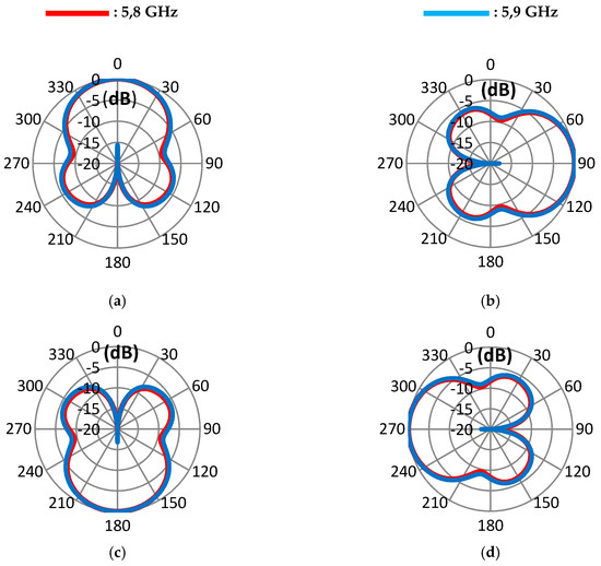 Far-field radiation patterns of the proposed antenna are simulated using an electromagnetic simulator. Figure 8a–d show the simulated radiation patterns in the azimuth plane (XOY plane). The main beam of the proposed antenna can be steered to approximate ϕ = 0°, ϕ = 90°, ϕ = 180° and ϕ = 270°, for State 1 to State 4, respectively. The radiation patterns in elevation are similar and the main beam directions all point at θ = 36°. Far-field radiation patterns at frequencies 5.8 GHz and 5.9 GHz in the azimuth plane show that the proposed wideband reconfigurable pattern antenna radiates in four different directions as shown in Figure 8 and Figure 9.