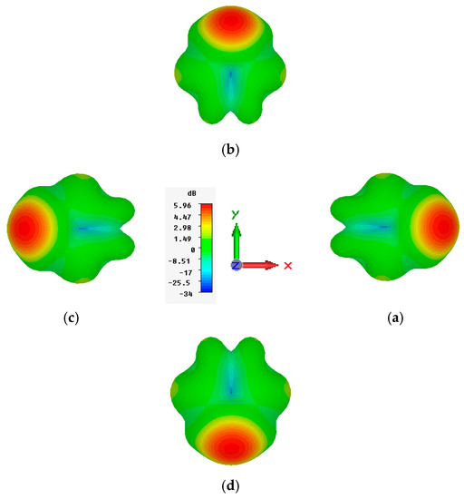 Simulated 3D radiation patterns at 5.8 GHz: (a) State 1, (b) State 2, (c) State 3, (d) State 4.