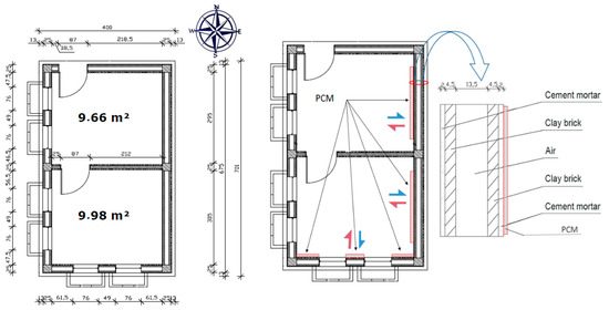 In this work, the PCM wall board was proposed to be embedded in the inside part of the eastern and southern building faces, because those faces were assumed to receive the highest amount of daily solar radiation. Furthermore, this study intended to limit the integration of the PCM in the whole building for economic reasons and to investigate firstly the partial PCM integration in building walls (Figure 2).